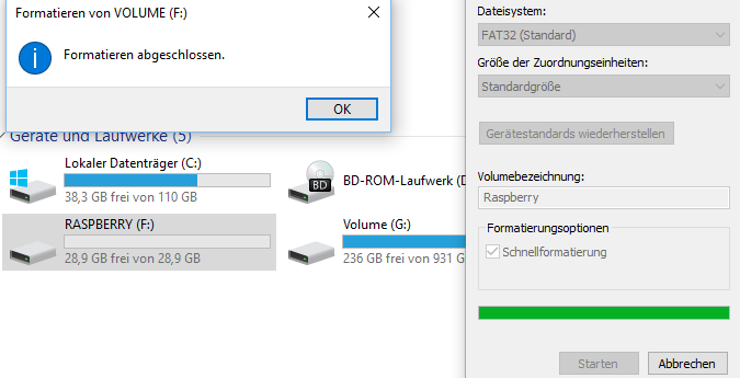 Auf dem Bild siehst du, wie die SD-Karte eingebunden als Volume (F:). Bei dir könnte ein anderer Pfad angegeben sein. Wenn du deine SD-Karte nicht siehst, dann schau nach, ob du sie richtig in das Lesegerät eingefügt hast. Wenn vorher keine empfindlichen Daten auf der SD-Karte waren, kannst du sie, um Zeit zu sparen Schnellformatieren.