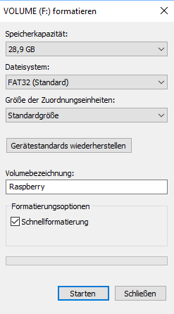 Beim Formatieren geht es darum, dass du die SD-Karte frei machst für das zukünftige Betriebssystem (NOOBS und Raspbian). Auch musst du die SD-Karte auf das Format FAT32 formatieren, da der Raspberry, sowie viele andere Linuxsysteme dies brauchen, um eine Festplatte (die SD-karte ist der Festplattenersatz für den Raspberry) lesen zu können. Gib der SD-Karte auch einen Namen, sodass du sie immer schnell am Computer finden kannst. Wenn du alles richtig eingestellt hast, sollte es bei dir so ähnlich ausschauen wie auf dem rechten Bild.