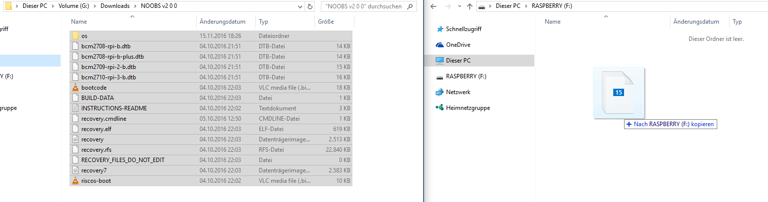 Kopiere jetzt wie auf dem Bild den Inhalt des NOOBS-Ordner auf die SD-Karte.