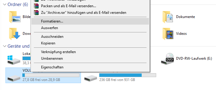 Nun machst du einen Rechtsklick auf die SD-Karte und wählst Formatieren aus.